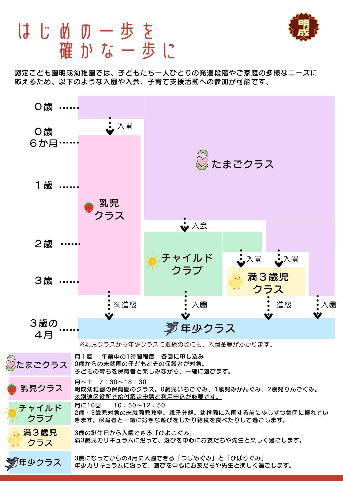 幼保連携型認定こども園とは、教育・保育を一体的に行う施設で、幼稚園と保育所の両方の良さを併せ持っている施設です。認定こども園明成幼稚園は0歳児~5歳児の子どもたちが過ごす利用定員154名の施設です。